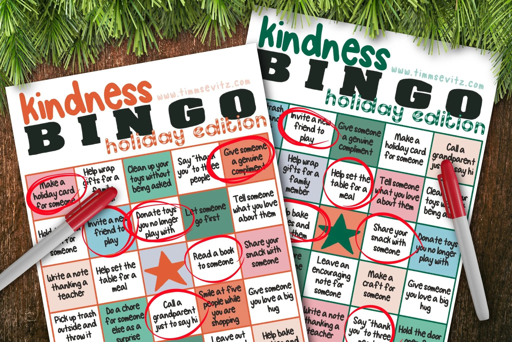 I also created two different versions of the bingo cards. One is red, and one is green. Both cards use the same kindness ideas, but the squares are arranged in different spots. It keeps things fun and adds a little extra surprise to the game.